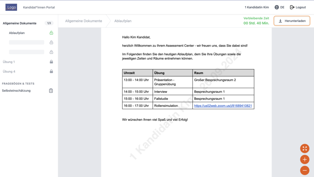 Neu im Assessment: Alle PDF-Dokumente, die im Kandidat*innen-Portal angezeigt werden, können jetzt optional mit einem Wasserzeichen versehen werden. Dieses Wasserzeichen besteht aus dem Namen der/s Kandidat*in und dem Assessment-Datum. Dadurch wird nochmal die Prozess-Sicherheit erhöht und ein Weitergeben der Dokumente erschwert.