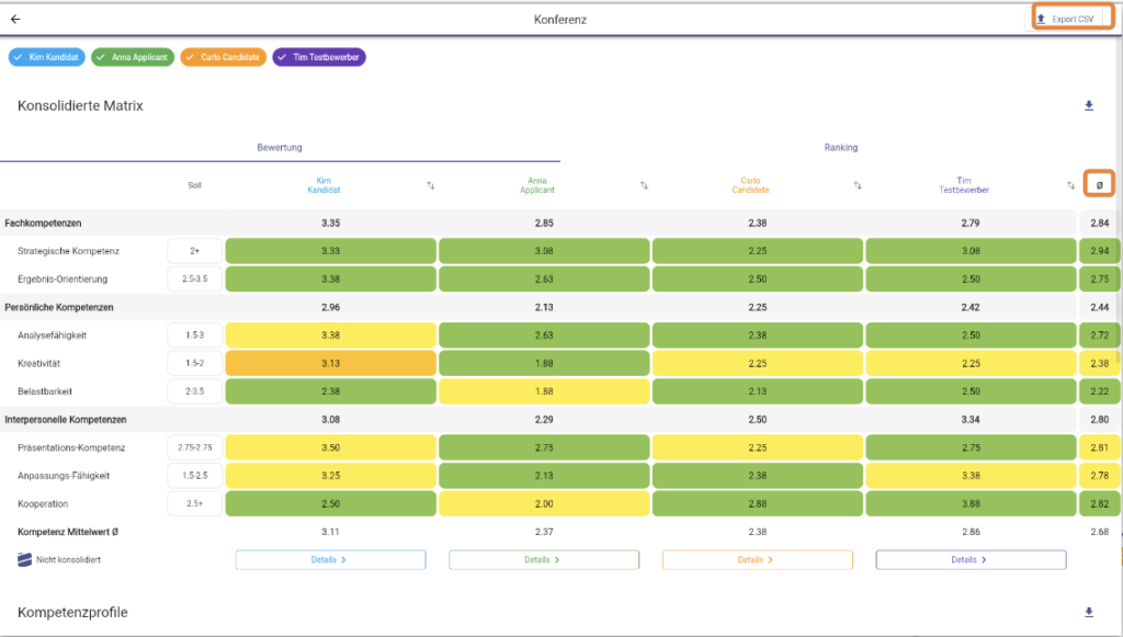 • Prozentangaben in Berichten: Berichte können nun so konfiguriert werden, dass alle Werte als Prozentangaben dargestellt werden. Dies hilft, die Zielerreichung der Kandidat*innen klarer zu kommunizieren und die Ergebnisse besser zu visualisieren.