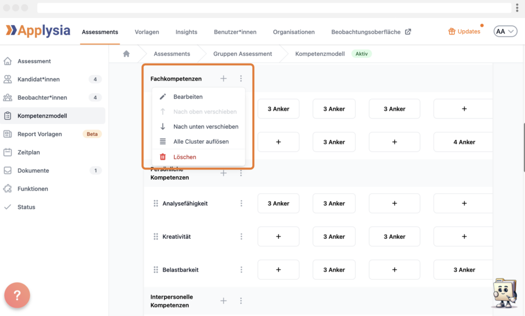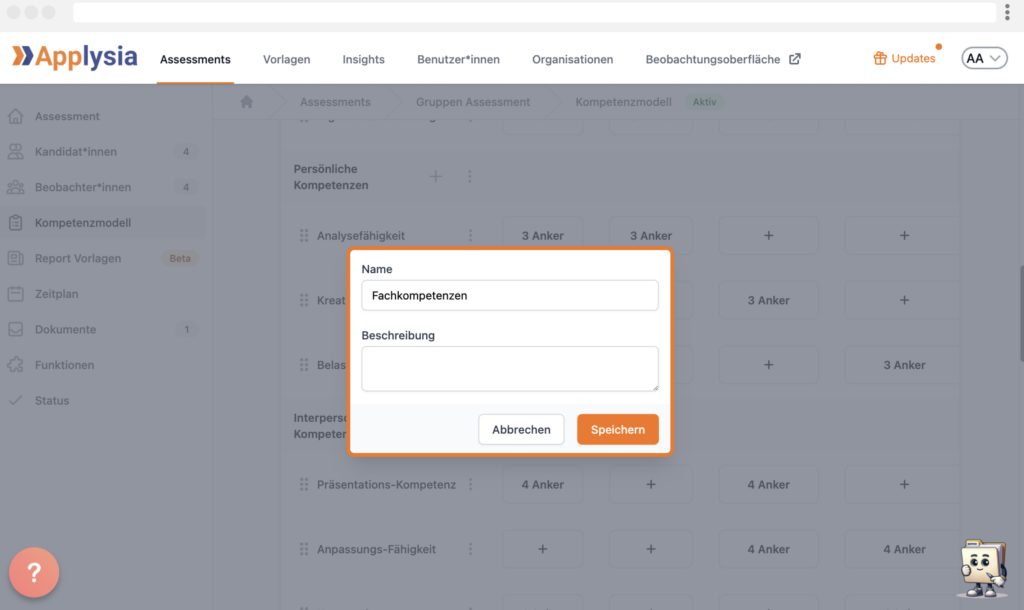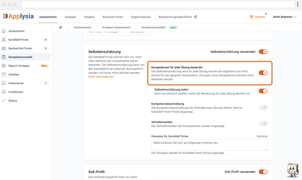 Ab jetzt ist das Hinzufügen von Beschreibungen für Kompetenz-Cluster möglich. Mit diesem neuen Feature lassen sich zusätzliche Informationen zu den Kompetenz-Clustern hinterlegen, die auch in den automatisierten Ergebnisbericht integriert werden können. So besteht die Möglichkeit, eure Ergebnisberichte noch präziser und spezifischer zu gestalten.