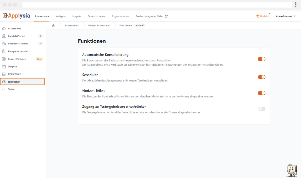 Administrator*innen können nun einstellen, ob bestimmte Beobachter*innen Daten in einem Assessment exportieren dürfen. Diese neue Option stellt sicher, dass nur berechtigte Personen Daten exportieren können, um die Verbreitung sensibler Informationen an Kandidat*innen zu verhindern. In der App sind die Schaltflächen zum Datenexport für  Beobachter*innen ohne entsprechende Berechtigung nicht mehr sichtbar.
